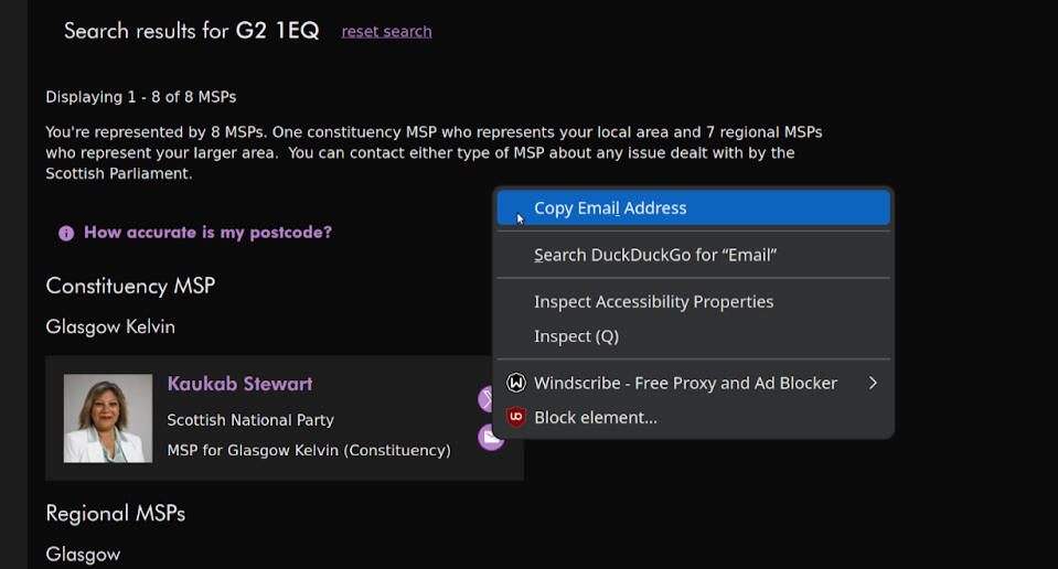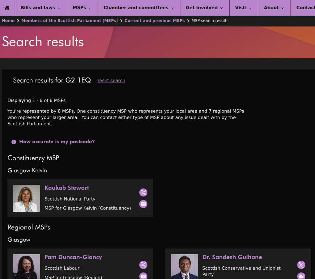 1. Go to www.parliament.scot/msps and type in your post code to find out who your MSPs are. For example, here’s what you’d see if you lived on George Square, Glasgow: